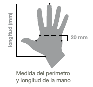 Tallas y medidas de las manos: se consideran dos medidas principales: circunferencia de la mano y longitud (distancia entre la muñeca y la punta del dedo medio), el perímetro de la mano se mide a 20mm de distancia del vértice entre el dedo pulgar e índice.